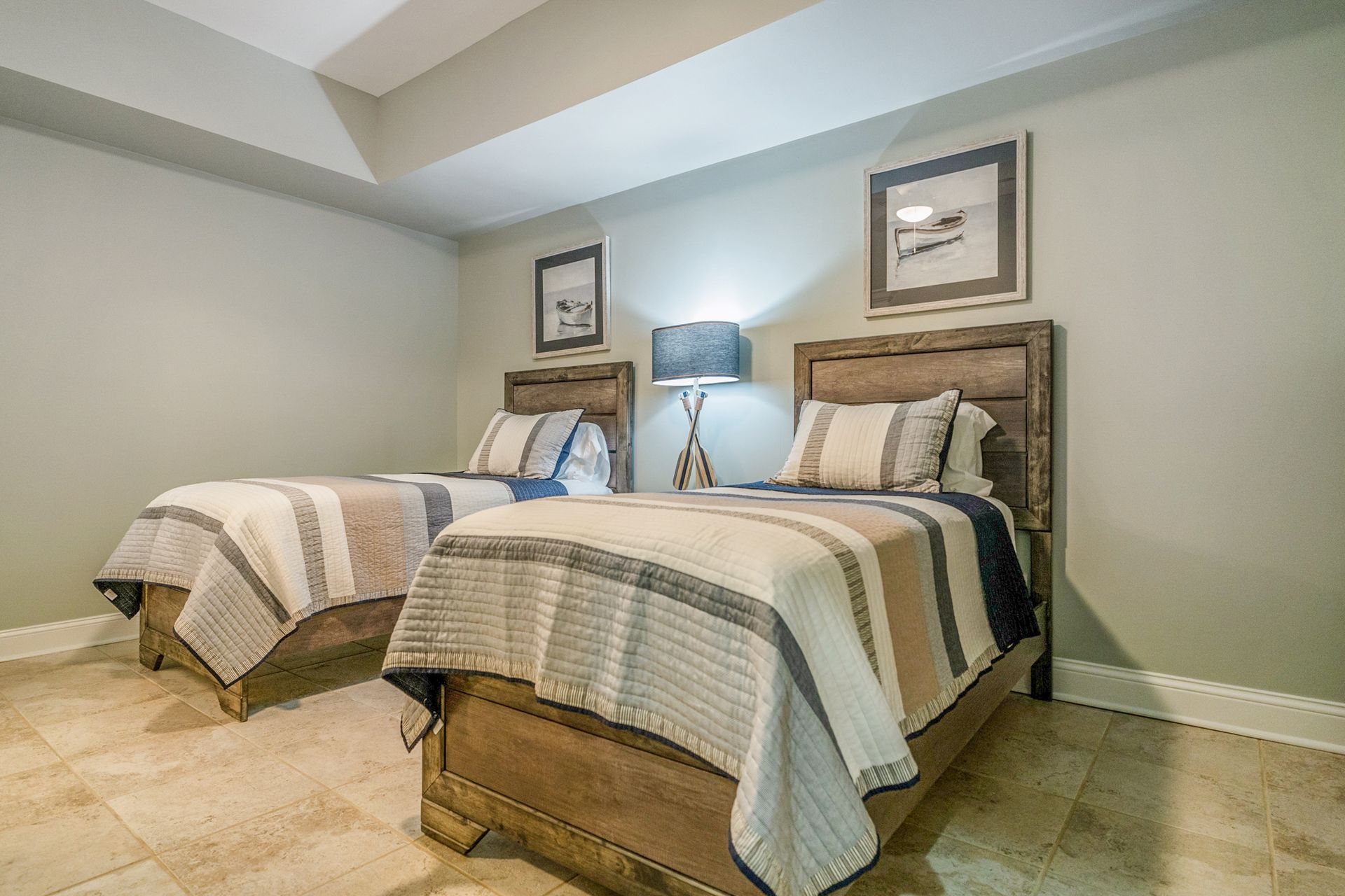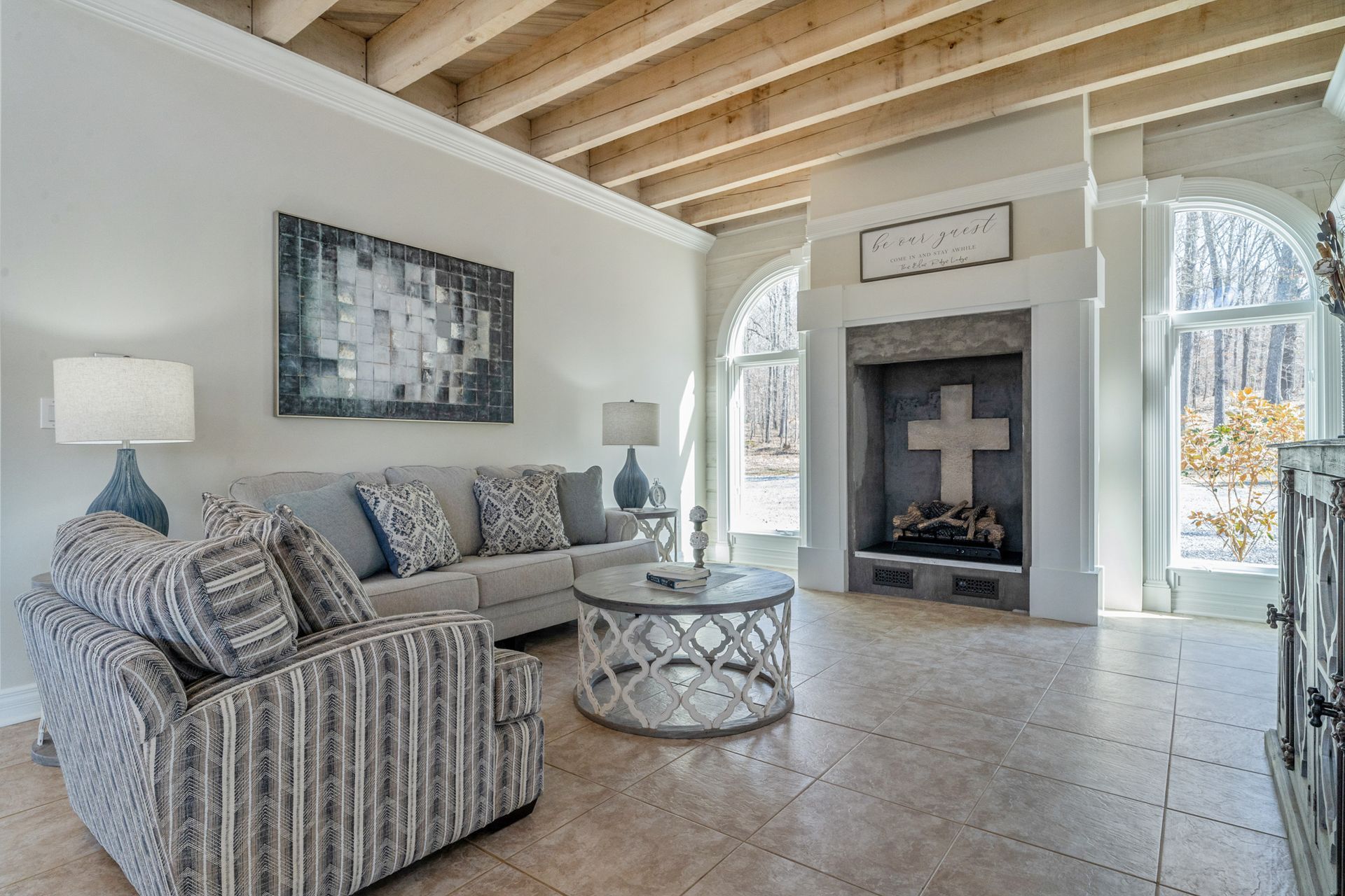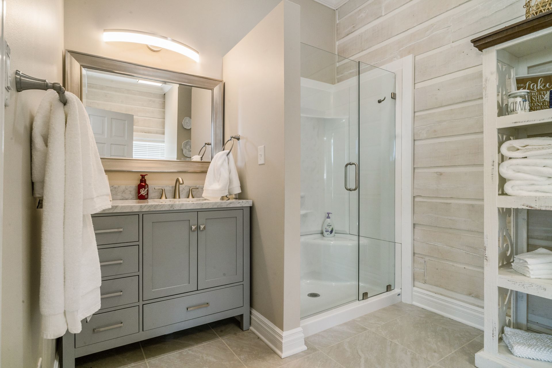 We believe that making memories with your family is the most precious thing in life. That's why we offer a relaxing and spacious setting for your getaway. Our upper level features a king/full bedroom, a queen/trundle daybed bedroom, and a beautifully designed bathroom with a custom tiled shower, jacuzzi tub, and double vanity. Plus, there's a cozy sitting area where you can unwind and connect with your loved ones. Get ready to create unforgettable moments together at Blue Ridge Lodge.